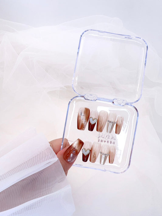 P409 Nude Brown Love Gold French press on nails Long Ladder press on nails
