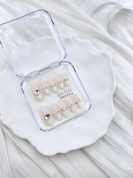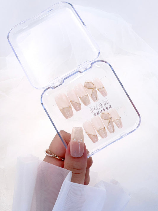 P163 Nude white shell gloss gold edge French style long handmade press on nails