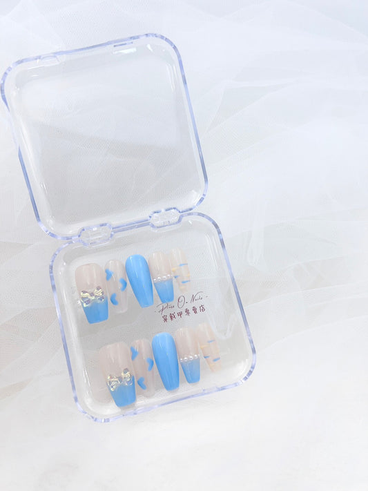 P405 aqua blue nude love bow wearing armor long ladder press on nails