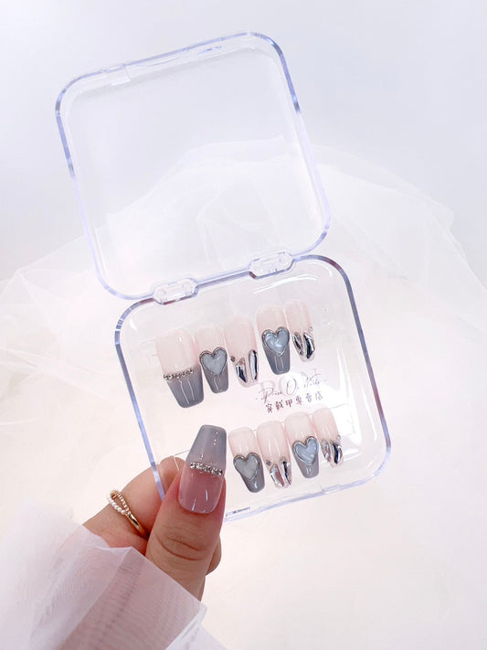 P415 Icy pink smudged black French style , pure handmade press on nails